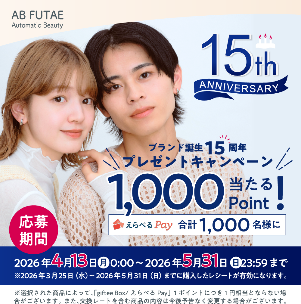 キャンペーン対象商品 AB FUTAE商品をお買い上げいただき、ありがとうございます。キャンペーン応募サイトは2026年4月13日に公開します。しばらくお待ちくださいませ。
