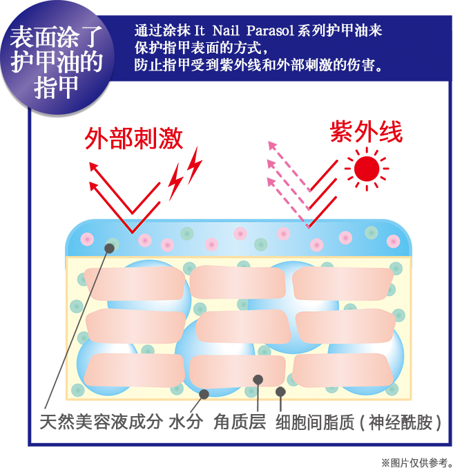 通过抗紫外线,从而保护指甲,防止干燥引起的指甲受损。
